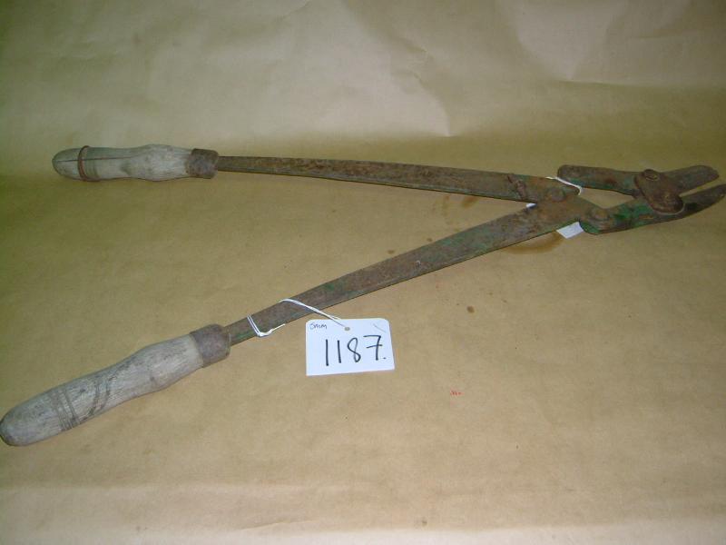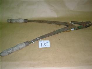 Puiset pyöristetyt kädensijat, joiden toisessa kahvassa rautalankaa. Kahvoista jatkuu metalliset litteät pitkät osat, joiden päässä pultein kiinni kaarevat osat, jotka tulleet sorkan ympärille. Pihdit avautuu ja sulkeutuu. Vihreän väriset.