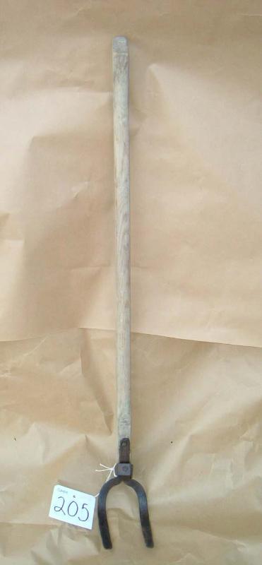 Puisen yläpäästä vähän kaartunvat varren päässä on kaksipiikkinen rauta. Terä kiinni varressa naulalla ja rautalenkillä. Maalaamaton.