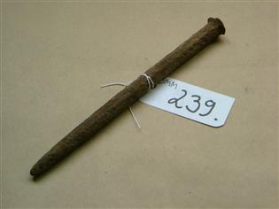 | huomiot | Valmistusaika: 1957 jälkeen todennäköisesti; Viiteet ja lähteet: Muistio lahjoituksesta.; Vauriot: Ruostetta; Lahjoittaja: Helga Sandell; Valmistus: Todennäköisesti Alvi Sandellin tekemä kotiahjossaan. Muurla, Varsinais-Suomi.; Lisatiedot: Esineet 209.-219. ja238.-258. kuuluvat samaan kokonaisuuteen, joka on kerätty Alvi Sandellin kotitarvepajasta. |
