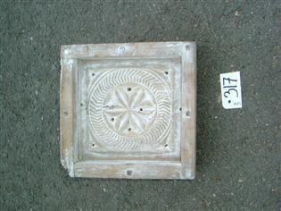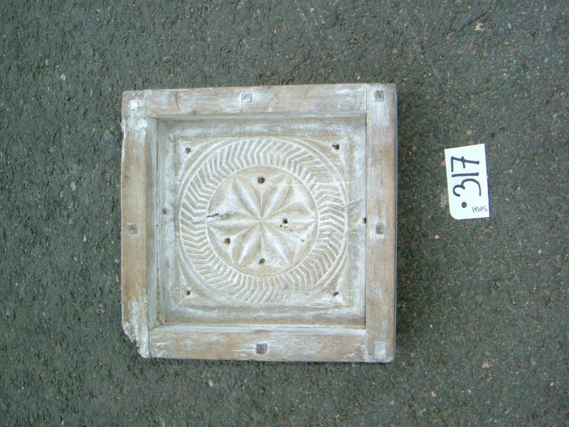 Pohjakappale neliön mallinen, sisäpuolella koristekuvio, jossa keskellä tähti ja tähden ympärillä kalanruotokuviota. Reunat kiinnitetty pohjaan puutapeilla. Pohjassa reikiä.