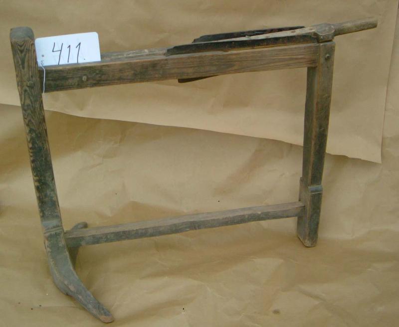 Puusta tehty kahden jalan varassa seisova kehikko. Alhaalta jalkoja yhdistää tukipuu. Toinen jaloista alhaalta puolikuun mallinen ja ylöspäin levenevä. Jalkoihin kiinnitetty yläosaan puutapeilla ja nauloilla kaksi sivuttain olevaa lautaa, joissa molemmissa kiinni litteät, pitkänomaiset rautakappaleet. Lautojen välissä kädensijalla varustettu lauta, jossa veitsimäinen terä.