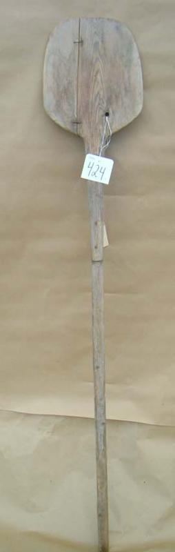 Yhdestä lankusta tehty täysin suora leipälapio, jossa kulmat ja reunat pyöristetty. Lapio-osa on neliönmallinen ja varsi ohut. Maalaamatonta puuta, varren päässä hieman valkoista maalia ja naula.