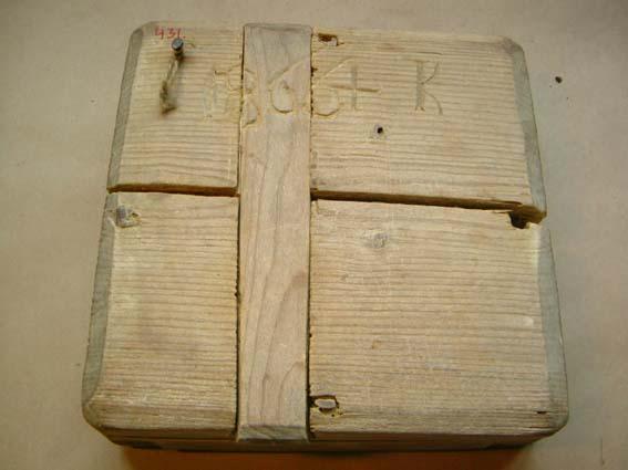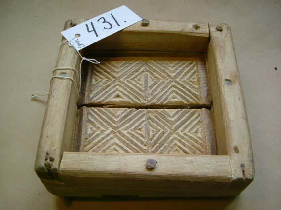 Useammasta erillisestä palasta koottu juustomuotti, jossa reunat on yhdistetty pohjaan puutapeilla. Pohja kuudesta eri palasta ja muotti pohjasta keskeltä kokonaan halki. Muutenkin palat irronneet osittain toisistaan. Muotti on neliön muotoinen, pohjassa on koristekuvio, jossa neljän ruudun sisällä on rastimaisia kuvioita, joiden sivustalla puolestaan kolmiomaisia kuvioita.