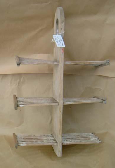 Puinen, suorakaiteen muotoinen, pystypäin oleva lauta, jonka toinen pää veistetty renkaan muotoiseksi ja siihen tehty iso reikä keskelle. Laudan läpi menee kolme puista, leveää "ritilää". Ritilät on tehty neliön muotoisista puukapuloista, joiden päät on ohennettu. Jokaisen ritilän päihin on lyöty paksummat puukapulat, jotta teline pysyy paremmin kasassa. Yksi kapuloista on lähtenyt irti. Muutama sidottu kiinni narulla.
