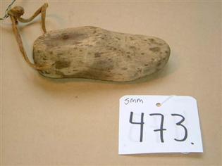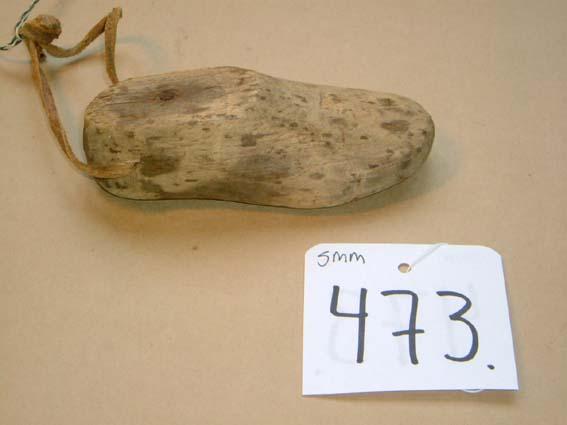 Pienen lapsen kengän muotoinen puusta veistetty muotti. Kantaosan läpi tehty reikä, josta pujotettu läpi nahkanaru. Pohjaan lyöty puunauloja, yläosaan yksi rautanaula.