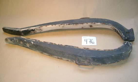 2 toisitaan irti olevaa längen puoliskoa. Etupuolelta maalattu mustaksi, takaosa puunvärinen. Molemmissa sivuilla rautaiset lenkit. Längen osat ovat kaarevat, alapäästä ne kääntyvät vastakkaiseen suuntaan ja kapenevat. Toisessa ylhäällä neliömäinen osa, jossa reikä keskellä. Toisessa on ylhäällä lovi. Sivuihin on hakattu nauloja.