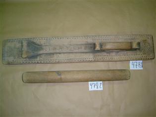 | huomiot | Valmistusaika: 1843; Lahjoittaja: Leena Koivukoski; Käyttöaika: 1843 alkaen.; Viiteet ja lähteet: Lahjakirjan liitteet 21.4, 19.5 ja 27.5.2004 Lahjakirja 27.5.2004, nro 36. Leena Koivukoski, suullinen tieto 22.4. ja 19.5.2004 Vuorela, Toivo: Kansanperinteen sanakirja, Porvoo 1981. Kautovaara, Pekka: Kättentöitä, Keuruu; Otava 2002.; Merkit: W:1843 E.H.S Toisessa päässä kukkakuvio, toisessa aurinkoa muistuttava kuvio.; Vauriot: Puu halkeillut ja tummunut.; Lisatiedot: Kaulauslaudat ja -tukit ovat olleet suosittuja morsiuslahjoja ja usein hyvin koristeltuja. (Vuorela 1981, 151). Kaulauslauta- ja -tukki ovat Ernesti Koivukosken kotoa Lammilta. (Leena Koivukoski 19.5.2004). Vaate kiedottiin tukin ympärille tiukasti. Kaulauslaudalla painettiin tukkia penkkiä vasten samalla vierittäen ja näin pyykki silittyi. (Kautovaara 2002, 138.) |