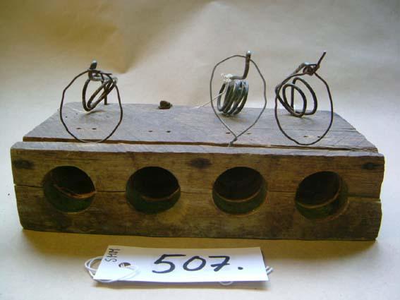 | käyttötapa | Hiirien surmaaminen. Puuosassa oleviin koloihin on laitettu hiirtä haukuttelevaa ruokaa. Ruokaan kiinnitetty lanka on pitänyt alhalla kojen edessä olevia, metallilangasta tehtyjä silmukoita. Hiiren syödessä herkkupalaa, se samalla syö langan poikki, jolloin silmukka ponnahtaa ylöspäin ja hiiri jää kuristuksiin. |