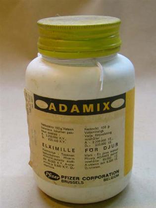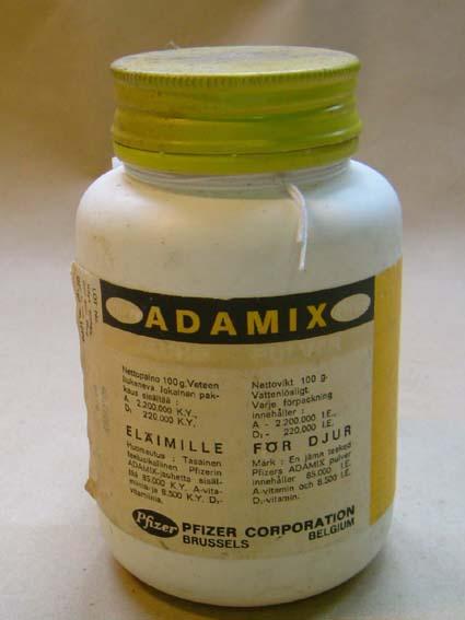 Vitamiinipurkki (a- ja d-vitamiinia), tarkoitettu eläimille. Tuotenimi: Adamix, vitamiinia ollut 100g. Valkoinen muovipurkki ja keltainen metallinen kierrekorkki. Keltavalkoisessa etiketeissä mm. annostusohjeet suomeksi ja ruotsiksi. Sisällä keltainen, muovinen annostuslusikka.