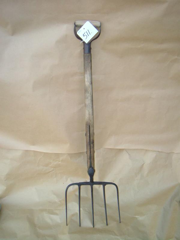 Terässä viisi metallipiikkiä vierekkäin. Piikit lyhennetty juurekkaiden nostoa varten ja ne ovat pituudeltaan noin 21,5 cm. Terän yläosasta kiinnitys upottamalla puiseen varteen, metalliniitit. Puisen varren pituus 62 cm. Metallinen kädensija puoliympyrän muotoinen, kiinnipitokohta puuta. Metalliliepeet taivutettu varren ympärille, kiinnitys niiteillä.