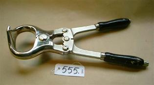 Pihtien kädensijat ovat puuta ja mustaksi maalatut. Pihdissä on neljä niveltä. Pihtien päät muodostavat kiinni ollessaan soikion. Toisessa kädensijassa, puuosassa, osittain jälkellä valmistajan tarra: turkoosi pohja ja kultainen painatus. Toisen kädensijan metalliosassa valmistajan leima: AESCULAP, sauvan ympärille kietoutunut käärme ja sen yläpuolella kruunu.