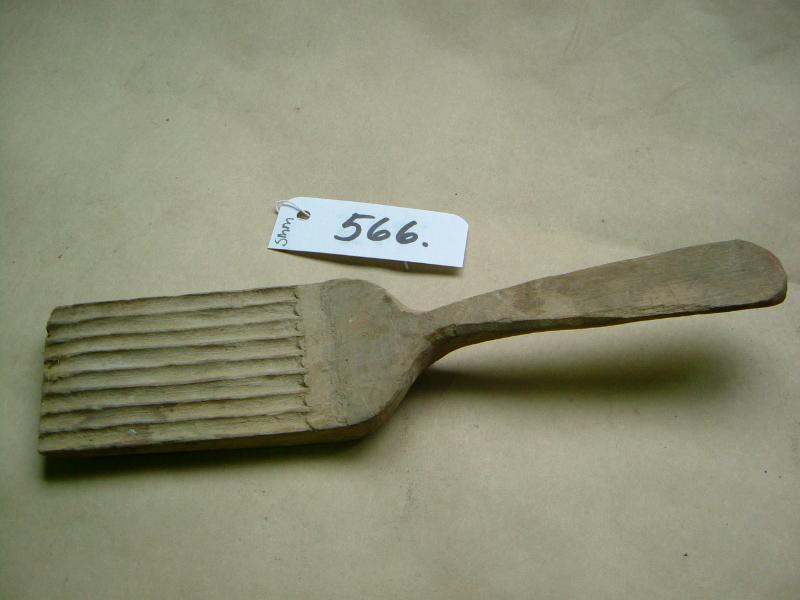 Yhdestä puusta veistetty, maalaamaton lasta. Lastaosa on suorakaiteen muotoinen ja uurteinen. Kahva levenee ylhäällä.
