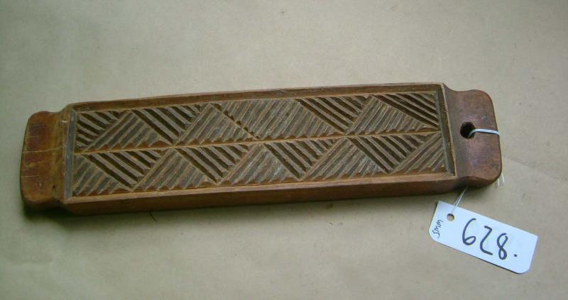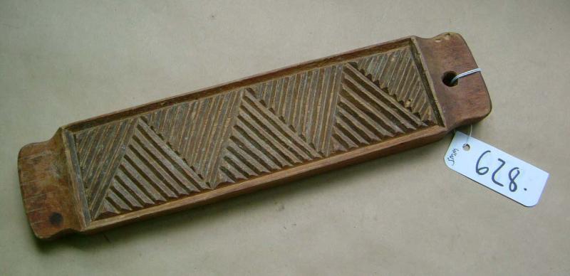 Suorakaiteenmallinen muotti, joka päistä pyöristetty. Toisella puolella koristelupuuta on uurrettuja suurempia lomittain olevia kolmioita, toisella puolella samanlainen kuvio, mutta kolmiot pienempiä, joten kuvio mahtuu toistumaan 2 kertaa. Keskellä kuviota menee vako. Laudan reunat korkeampia kuin itse kuvio. Laudan toisessa päässä on reikä.