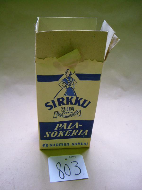 | huomiot | Valmistusaika: 1950-60-luku; Viiteet ja lähteet: 16.7.2004 Lahjakirja nro 42 ja lahjakirjan liite.; Merkit: SIRKKU 200 vuotta sokeriteollisuutta PALASOKERIA Suomen sokeri (toisella puolella sama ruotsiksi). 1kg; Vauriot: Kellastunut, yläosasta paperi repeillyt.; Lahjoittaja: Eeva Taneli; Valmistus: Sirkku palasokeria on valmistettu vuodesta 1928. |