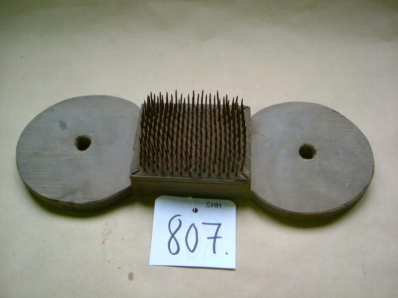 Koivupuusta tehty lyhyt lauta, joka on molemmista päistä ympyrän mallinen ja ympyröiden keskellä on reiät. Ympyröiden välissä olevaan suorakulmion malliseen osaan on kiinnitetty päällekkäin kaksi ohutta puulevyä ja niiden päälle peltilevy, johon on lyöty altapäin nauloja niin, että niistä muodostuu piikkimatto. Puuosa on petsattu vaalean ruskeaksi.