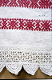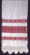 Pellavapalttinaa, tih. loimessa 17 l/cm, kuteessa 13 l/cm. Molemmissa päissä kolme punapoimintaraitaa; leveydet 4,5cm, 9cm, 4,5cm. Kummassakin päässä valkoiset, pykäreunaiset, virkatut pitsit.