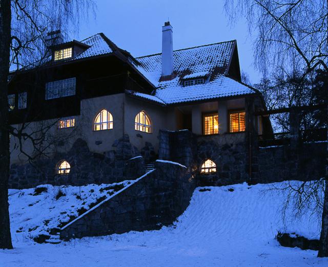 päärakennus,julkisivu rannan puolelta, hämärtyvä ilta, ikkunoissa valot, lähikuva