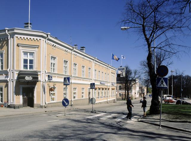 Esplanadi lännestä itään. Rakennuksista viimeisenä raatihuone. Etualalla vasemmalla vaaleanpunainen kivirakennus, jonka vieressä suojatie.