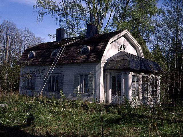 Oitbackan kartanon työväenasunto; mansardikattoinen puutalo. Kesä.