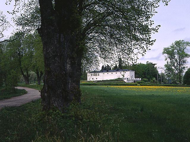 Oitbackan kartanon puisto, taustalla valkoinen rougeria eli kasvihuone.