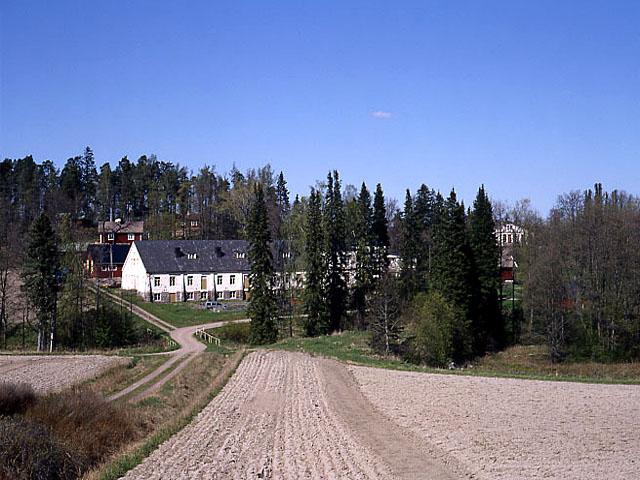 Oitbackan kartano kuvattuna maantien takaa. Vasemmalla navetta, oikealla puistossa päärakennus. Etualalla peltoa. Kevät.