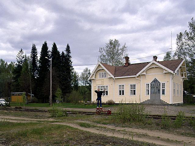 Kuvassa oikealla Putikon asemarakennus, jonka edessä kiskot ja resiina.