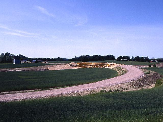 Muurla-Paimio moottoritien rakentaminen; kuvassa raivattua, keskeneräistä tietä, mutkassa siltarakenteita. Taustalla rakennuksia ja peltoa.