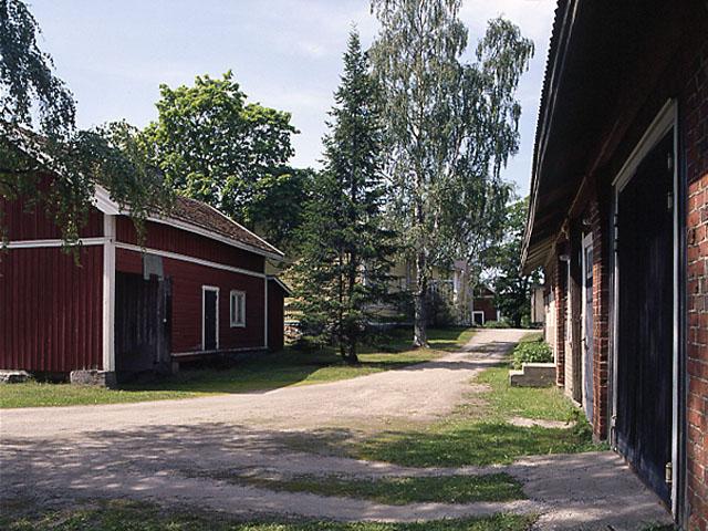 Kylän pihapiirejä; oikealla piharakennus punatiilestä, vasemalla puinen piharakennus.