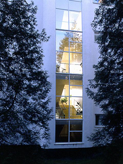Kuvassa parantolan nivelosan itäjulkisivu; pääportaan ikkuna. Ikkunan molimmin puolin havupuu. Funktionalismia.