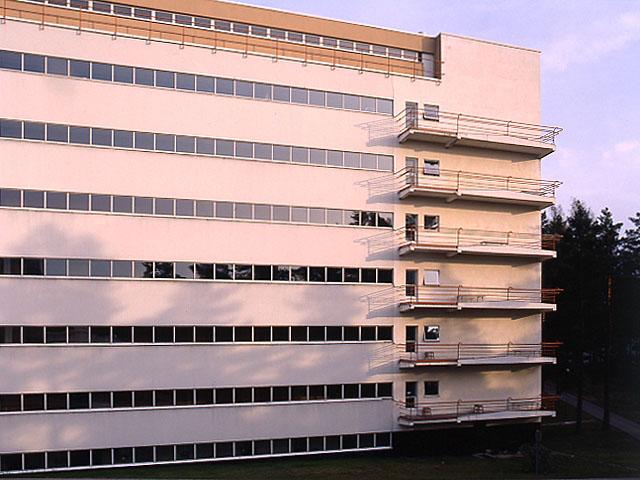 Parantolan potilashuonesiiven pohjoisjulkisivua; parvekkeet oikeassa laidassa. Funktionalismia.