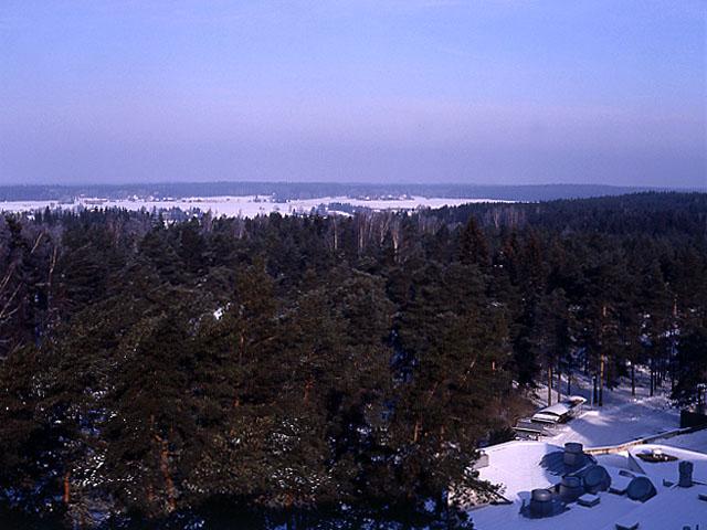Näkymä parantolan katolta pohjoiseen. Metsää ja peltoa.