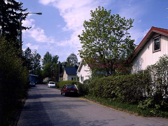 Pirkkolan rintamamiestalot. Kadulla on autoja parkissa ja taloja ympäröi orapihlaja aita.