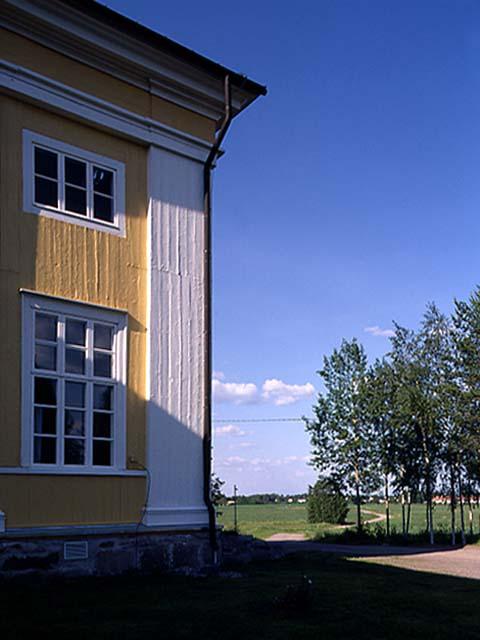 Limingan kirkko, kirkon kulmaus, taustalla kirkon kulttuurimaisemaa.