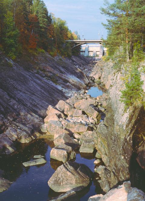 Imatrankosken uomaa vedettömämä, taustalla silta ja pato.
