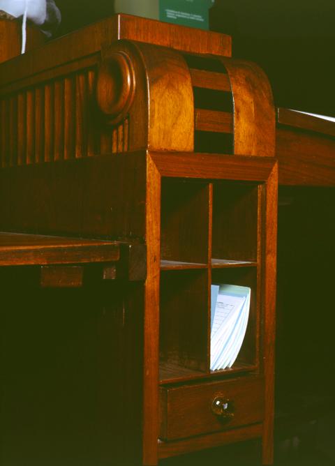 Helsingin Joutsen apteekin sisustusta ja yksityiskohtia. Puinen säilytyshyllykkö. Tyylinä art nouveau ja jugend.
