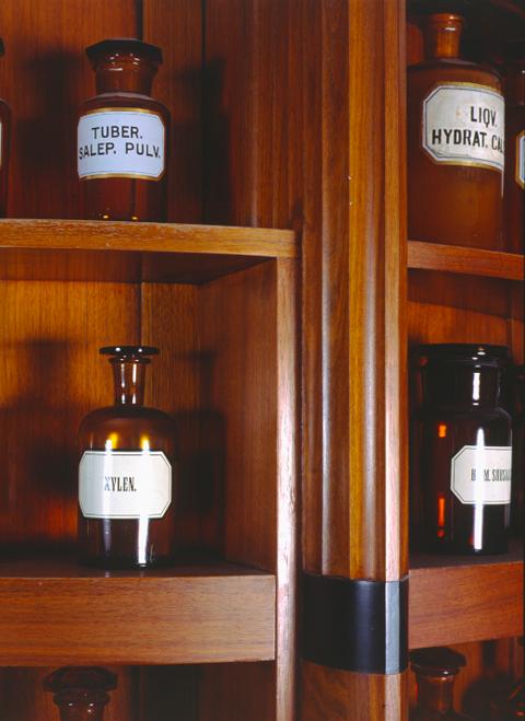 Helsingin Joutsen apteekin sisätilaa, sisustusta ja yksityiskohtia. Hyllyssä on lääkepurkkeja. Tyylinä art nouveau ja jugend.
