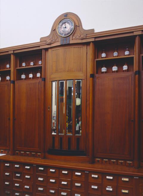 | asiasana | interiöörit, lääkkeet, puuesineet, hyllyt, kaappikellot, kalusteet, sisustus, farmasia, apteekit |