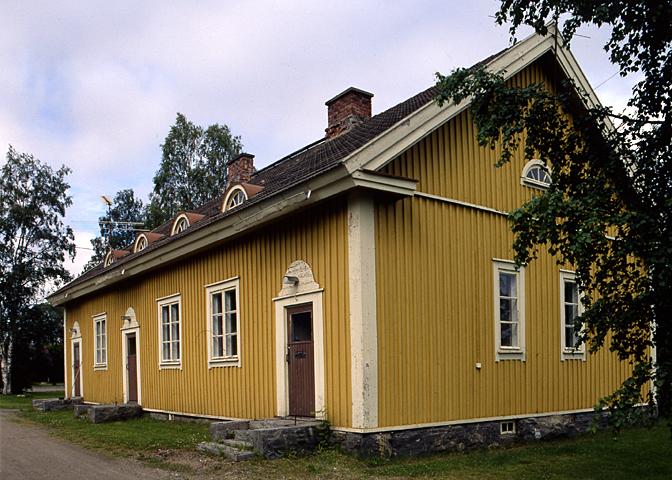 Keltaiseksi maalattu asuinkasarmi, puurakennus.
