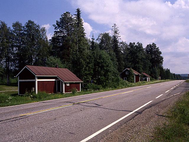 Asema-alue Kajaani-Oulu maantieltä katsottuna. Punaiseksi maalattu puurakennus.