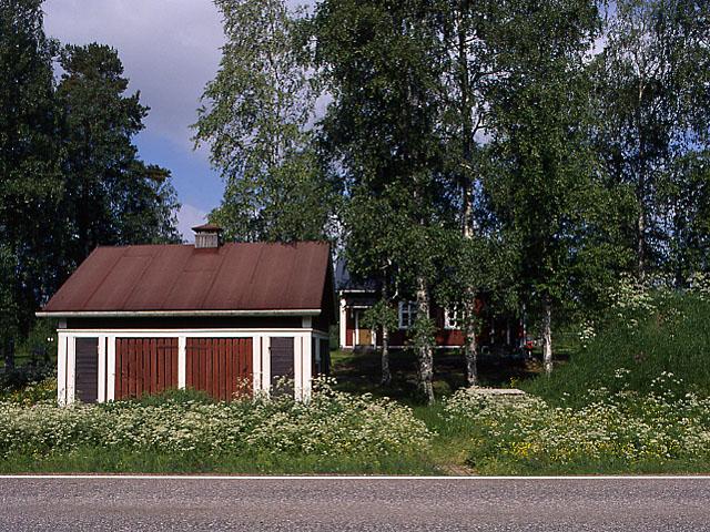 Pihapiiri, punaiseksi maalatut puurakennukset.
