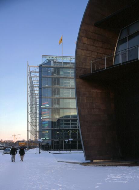| diapositiivi: Nykytaiteen museo Kiasman pohjoispääty läheltä, takana Sanomatalo |