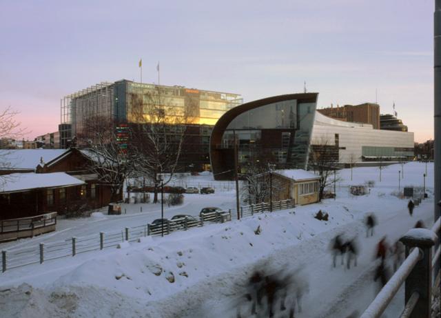 | diapositiivi: Nykytaiteen museo Kiasma ja Sanomatalo |