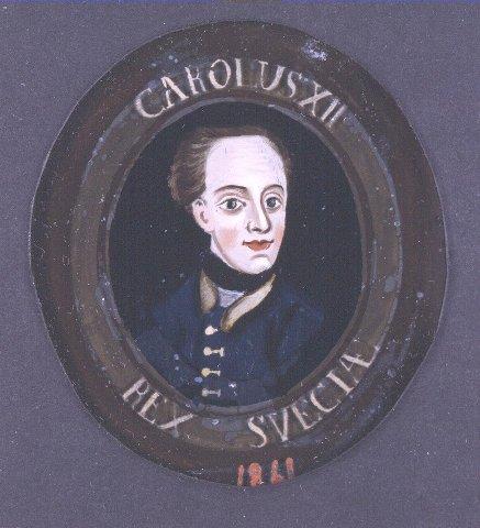 Soikealle lasinkappaleelle tehty maalaus. Miehen rintakuva en face. Lyhyet ruskeat hiukset. Sininen sotilaspuku, keltainen kaulus, tumma kaulaliina. Tumma tausta. Kuvasoikion ympärillä ruskea ja harmaa reuna, jossa teksti: CAROLUS XII REX SVECIAE. Suorakaiteen muotoinen pahvikehys.