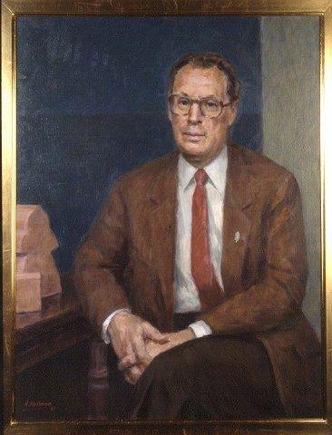 Istuvan miehen polvikuva, katse eteenpäin; harmaanruskeat hiukset, ruskeansiniset silmät, silmälasit. Ruskea pikkutakki, vihertävä paita, punainen solmio, tummanruskeat housut; kädet ristissä sylissä. Vasemmalla tummanruskea puupöytä, jota vasten oikea kyynärpää lepää, pöydällä on ruodetiili. Sinivihreä tausta, oikealla harmaanvihreä seinä. Sileä kullattu, litteä, sisäreunasta profiloitu kehyslista.
