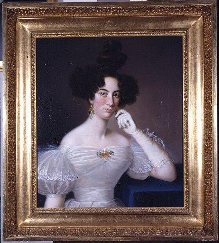 Öljymaalaus, malli puoliksi vasemmalle kääntynyt, vasen käsi nojaa vihreällä liinalla peitettyyn pöytään. Korkea kampaus, valkoinen puku, jossa pitsejä sekä hyönteistä esittävä rintakoru. Korvakorut. Kullattu kehys, jossa mm. akanthuskoristelua.