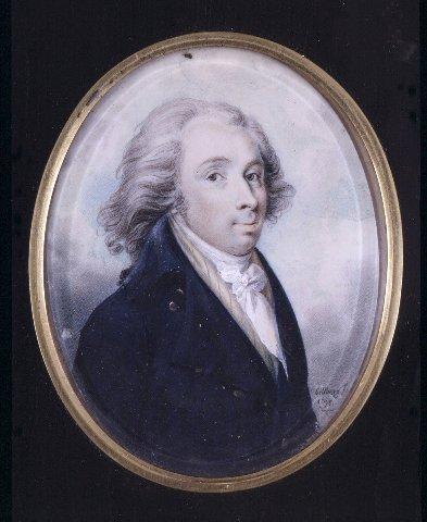 Soikea miniatyyri, miehen rintakuva oikealle, katse eteen. Taaksepäin kammatut, harmaat hiukset, hiukan kiharat ja melko pitkät. Ruskeat silmät. Tummansininen takki, korkeat kauluskäänteet. Takin alla vaaleanruskea raidallinen liivi, valkoinen paita ja valkoinen rusetilla oleva kaulahuivi. Taustalla pilvinen taivas. Ohuet messinki(?)kehykset. Kuvan päällä lasi, miniatyyrin takana pahvi. Miniatyyri on kiinnitetty mustaksi lakattuun, viiteen osaan taittuvaan puuraamiin, jossa mininatyyrit KM 26069:278.1-8.