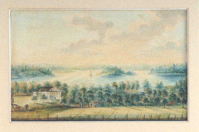 Kartanomaisema, vasemmalla päärakennus, etualalla alareunassa aita, keskellä niittyä ja puita. Taustalla järvi, jonka keskellä saari ja pieni purjevene. Mahonkikehys, jossa pronssirosetit mustissa kulmaneliöissä.
