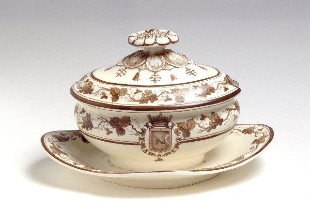 Kannellinen kastikekulho kellertävää Wedgewood-fajanssia. Kiinteä, soikea alusvati jonka reuna aaltoileva. Kulho keskeltä voimakkaasti levenevä, suuaukosta kapeampi, korvaton. Kannessa kukanmuotoinen nuppi. Ruskea maalauskoristelu lasitteen päällä: alusvadissa, kannessa ja kulhon yläosassa kapeiden raitojen välissä viininlehtiköynnös. Kulho-osassa köynnöksen katkaisee vapaaherrallisen Armfelt-suvun vaakuna Elefanttiritarikunnan ketjujen sisällä. Nupin ympärillä kannessa lehti- ja tupsukuvio.