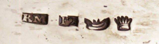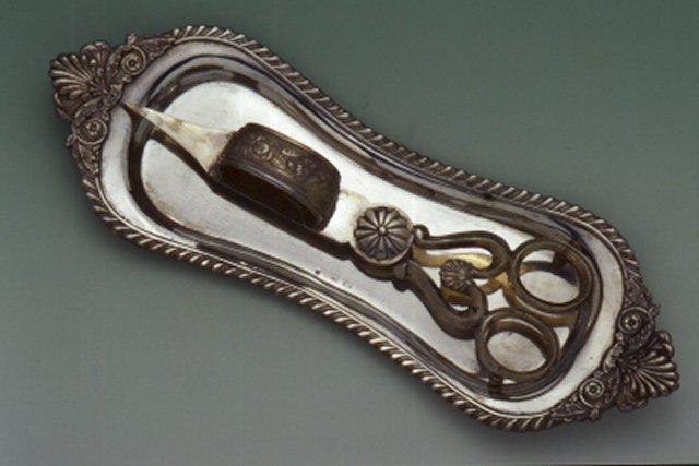 Tarjotin, pitkä, kapea, sivut keskeltä sisäänpäin kaartuvat, reunaa kiertää nyörinauha, päissä palmetti- ja akantuslehti. Saksien pesä puolipyöreä, sen päällä koristenauha, jossa viivoitetulla pohjalla ruusunoksia. Saksien varret koristettu palmeteilla.