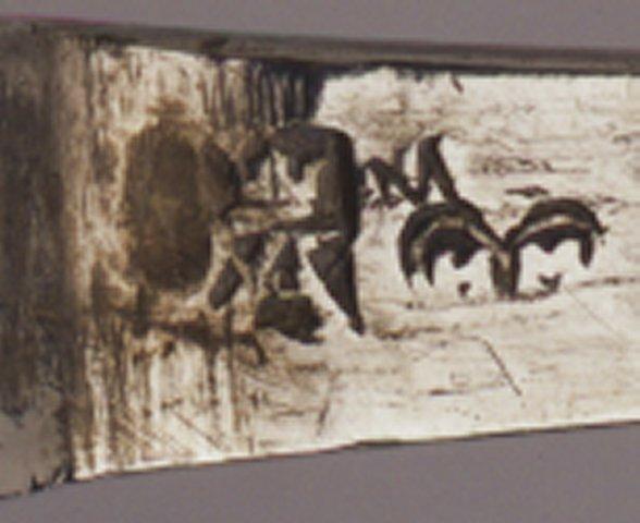| huomiot | Osan mitat: pituus 7.50 cm; leveys 5.20 cm; Leima: kruunattu A; HM; M; Tyyli: barokki; Osa: pesä |